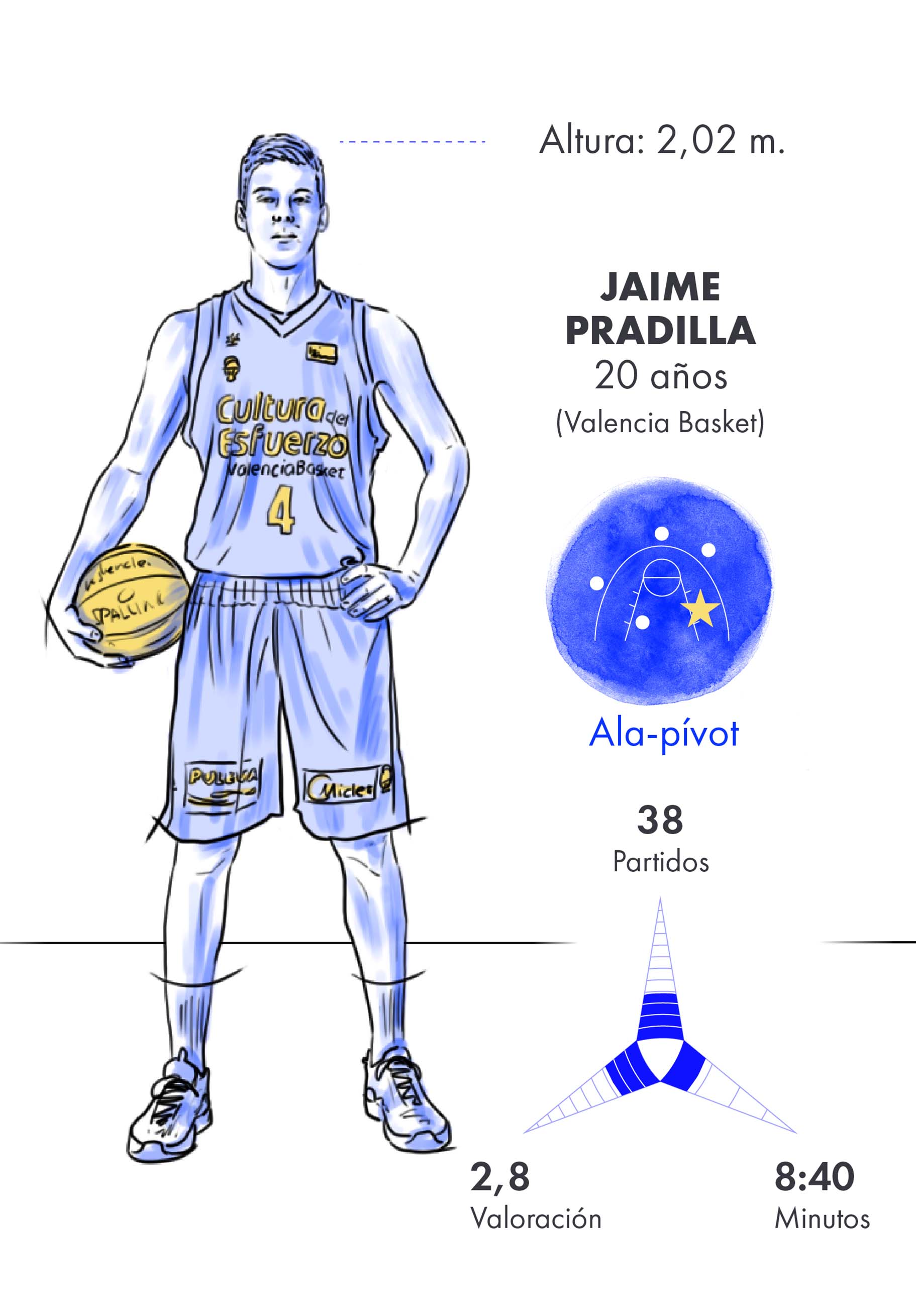 * La valoración es la fórmula estadística que suma los valores positivos de la actuación de un jugador (puntos, rebotes, asistencias, etc) y resta los negativos (tiros fallados, pérdidas, etc), dando una visión general del impacto del jugador en el partido. (Fuente: acb)