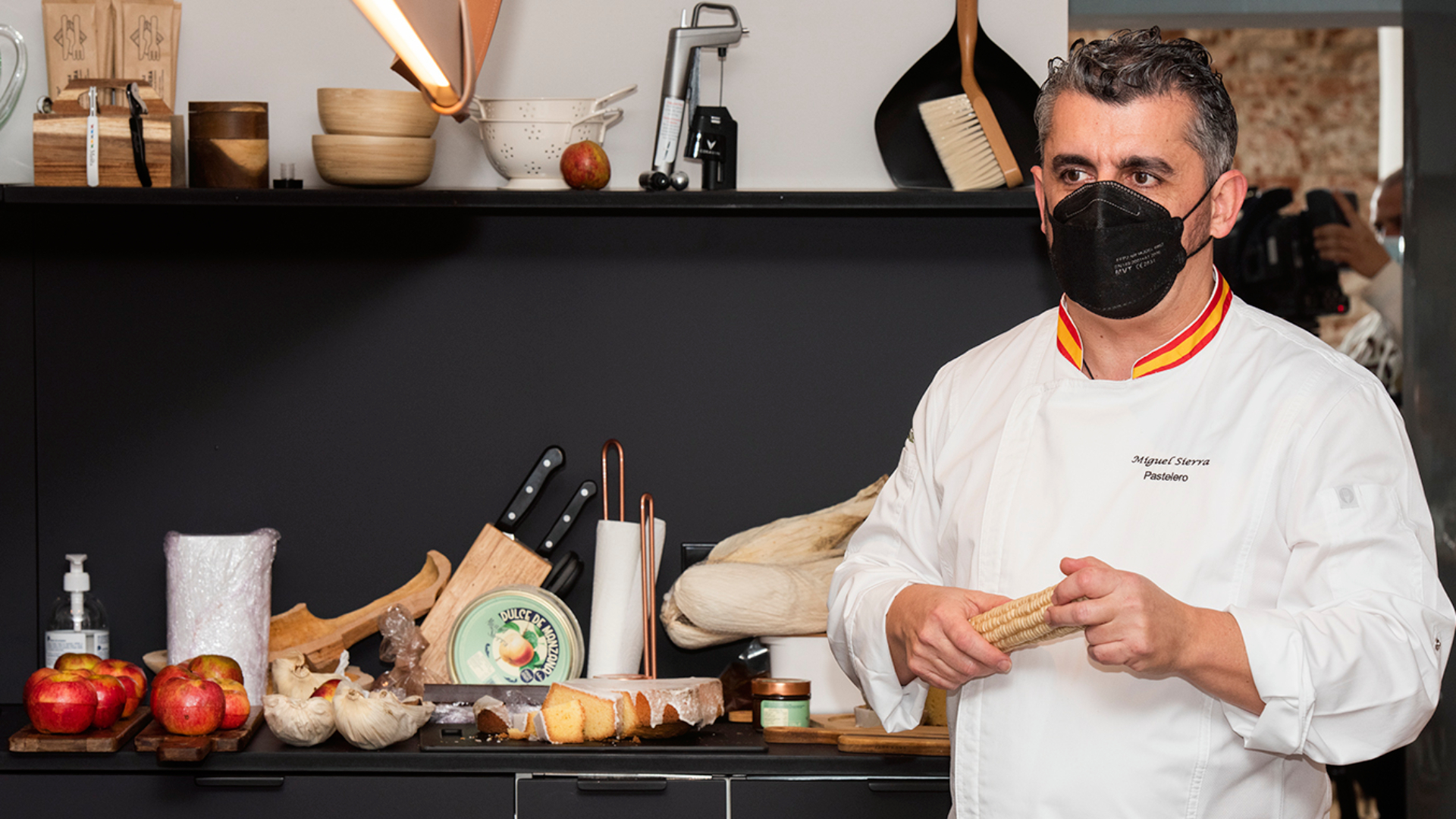 Otro ejemplo: el reconocido repostero y asesor gastronómico Miguel Sierra, que atesora diferentes galardones como el Premio de la Academia de Gastronomía de Asturias en la categoría de Dulcería, que sabe mostrar la visión más tradicional de la repostería asturiana. Dos de sus elaboraciones demuestran esa fusión de tradición y vanguardia como son el mantecado de maíz con dulce de manzana, el turrón siderúrgico de maíz y la manzana rellena de arroz con leche.