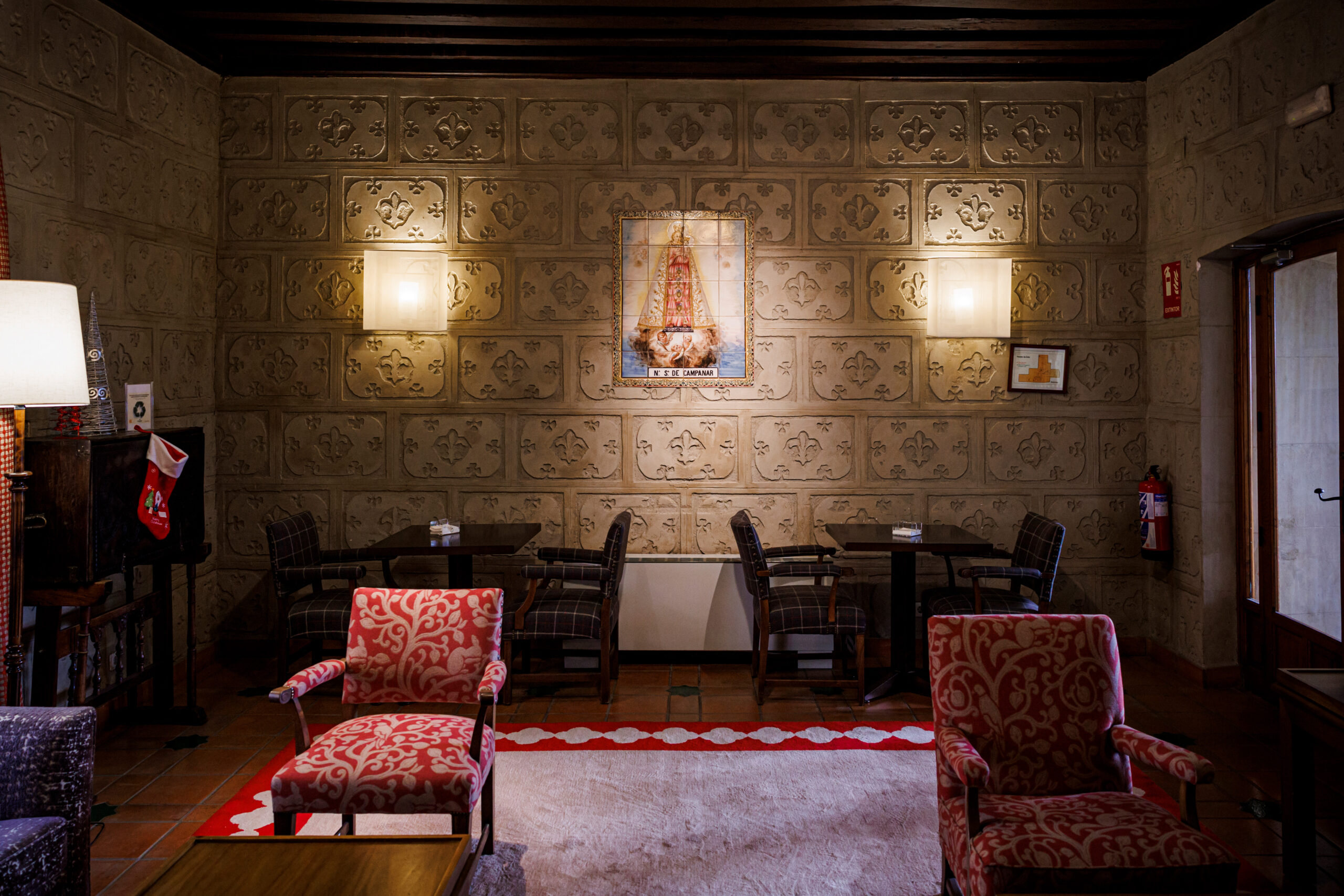 Coronado por una lápida con escudo heráldico del siglo XVI en granito, de este patio, a modo de distribuidor, surgen pasillos que conducen a las habitaciones, al comedor, a la cafetería, tapizados con muros decorados con relieves de una flor de lis que se repite, incansable, a lo largo de todas las paredes y que imprime de una atmósfera señorial y, por qué no, artesana. Una renovación por aquí, alguna pincelada decorativa por allá, pero fue en 2019 cuando se llevó a cabo una reforma para mejorar, como dice Víctor, “la calidad no percibida”, es decir, basada en infraestructuras que permitan que las instalaciones funcionen como es debido: dobles acristalamientos, refuerzo de tejados, en fin, esas acometidas que posibilitan a los huéspedes estar a gusto.