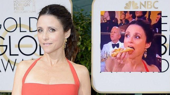 La actriz Julia Louis-Dreyfus, doblemente nominada en las categorías de cine y televisión en la ceremonia de los Globos de Oro, pasó toda la noche haciendo payasadas cada vez que las presentadoras preguntaban por ella. Empezó fumando un cigarrillo y con gafas de sol y acabó engullendo un voluminoso perrito caliente.