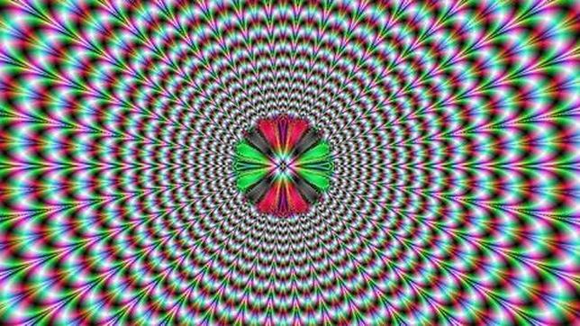 La que ves sobre estas líneas, por ejemplo, es una imagen estática. No es un gif, ni mucho menos un vídeo. Simplemente, la combinación de formas y colores provoca que, si te paras a mirarla fijamente, tu cerebro «crea» que hay movimiento en ella. Si tapas una zona concreta de la imagen utilizando una mano, enseguida te darás cuenta de que no es así.