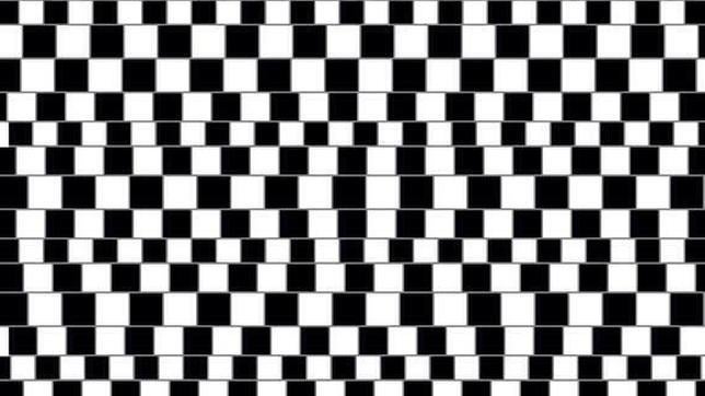 Ojo que vienen curvas... o quizá no. En este caso son las formas y la disposición de los recuadros blancos y negros lo que te «obliga» a creer que las líneas que van en sentido horizontal describen curvas. Si te quieres hacer la prueba, busca una regla y colócala sobre la pantalla, ¿a que son todas rectas?
