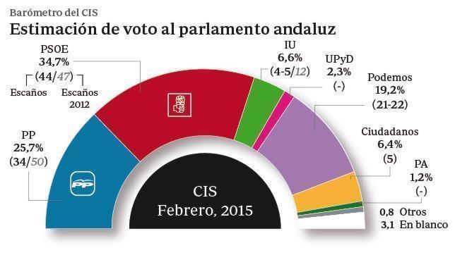 Según la encuesta, Susana Díaz (PSOE) sería la candidata más votada, con el 34,7 por ciento de los votos (44 escaños). Estos datos empeoran los resultados de José Antonio Griñán en 2012 (47), pero devuelve al PSOE al primer puesto. Eso es posible por la fuerte caída del PP, que con Juanma Moreno pasaría de 50 a 34 escaños, según el CIS, 10 por detrás del PSOE. El PP andaluz cae del 40,6 por ciento al 25,7 por ciento. Susana Díaz se quedaría a 11 escaños de los 55 necesarios para la mayoría absoluta, de modo que para gobernar de forma estable solo podría apoyarse en el PP o Podemos.