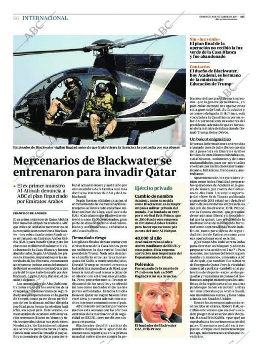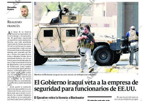 + infoABC ha dedico varias noticias a estos contratistas. En 2007, por ejemplo, el corresponsal en Washington Pedro Rodríguez los definió como el ejército privado más poderoso del mundo en un reportaje fechado el 18 de septiembre: «Afincada en Carolina del Norte y fundada en 1997 por un antiguo miembro de las fuerzas especiales de la Armada británica, ‘Blackwater’ es una de las cincuenta empresas de seguridad privada que operan en Iraq». Según los datos aportados por el periodista, la compañía entrenaba por entonces a «cerca de 40.000 personas al año en sus instalaciones» y constituía «el segundo mayor contingente en el país tras el Ejército de Estados Unidos». Su misión, al menos a nivel oficial, era la protección de VIPs: «Garantizan la seguridad de diplomáticos y altas personalidades en la zona».