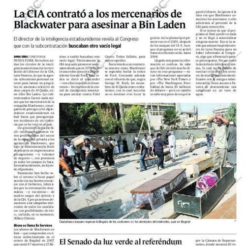 Lo que queda cristalino es que la palabra ‘mercenario’ se queda muy corta para ‘Blackwater’. Sus ‘operadores’ son mucho más. Hacen las veces de guardaespaldas, de soldados de fortuna, de asesores e, incluso, de miembros de las fuerzas especiales en los territorios de conflicto. Los más escépticos solo tienen que rememorar la noticia que publicó ABC el viernes 21 de agosto de 2009, cuando la caza del líder de Al Qaida suponía una verdadera molestia para el Gobierno de los Estados Unidos: «La CIA contrató a los mercenarios de ‘Blackwater’ para matar a Osama Bin Laden». El titular era solo la punta del iceberg, como bien explicó la corresponsal Anna Grau en el cuerpo del reportaje: «La agencia quería subcontratar personal para lanzar un programa de asesinato selectivo de líderes talibanes».