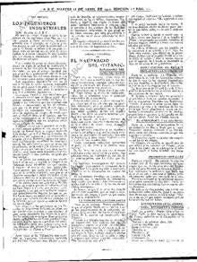 «Un despacho de Nueva York, con referencia a un radiograma recibido en Cape Race, dice que los náufragos del Titanic, recogidos a bordo del Carpathian, son 208 pasajeros de primera, la mayoría mujeres y niños; 55 de segunda, todos niños y mujeres; 412 de tercera y 193 tripulantes, o sea, un total de 868 personas. El hecho de que la mayoría de los salvados sean mujeres y niños demuestra que tanto el capitán como los oficiales supieron mantener a bordo la disciplina hasta el último momento. El Carpathian llegará á Nueva York el jueves por la tarde. Entre los pasajeros que han logrado salvarse se sabe hasta ahora que figuran la señora de Rostehild, el Sr. Thager, presidente de la Pensilvania Raihvad; el señor Duff London y su esposa y el Sr. Bruce Ismay, copropietario de la Compañía White Star, armadora del barco».