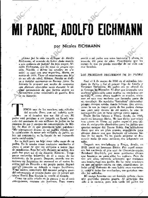 «Tengo uno de los nombres más odiados del mundo. Pero, aun así, todavía quiero al hombre que me dio el ser», escribía Nicolas Eichmann en «Blanco y Negro» en 1961. Su padre, el nazi Adolf Eichmann, había sido secuestrado por el Mossad en Argentina el 11 de mayo del año anterior y estaba a punto de ser juzgado en Israel por el asesinato de seis millones de judíos en las cámaras de gas y campos de concentración de Hitler durante la Segunda Guerra Mundial. De él se decía que había pronunciado estas palabras: «Me estremeceré dentro de mi tumba riendo, por la satisfacción de tener seis millones de judíos sobre mi conciencia, es la fuente de mi extraordinaria satisfacción».