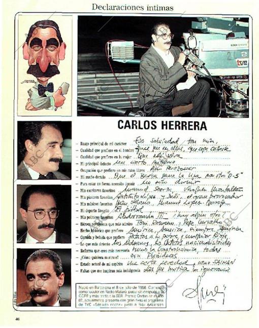 Carlos Herrera presentaba con gran éxito el programa de TVE «Sábado noche» junto a Bibí Andersen cuando realizó estas declaraciones íntimas que la revista «Blanco y Negro» publicó en 1989 y que hoy recordamos con motivo de su cumpleaños. Nacido en Barcelona el 8 de julio de 1956, el famoso periodista, que actualmente dirige el programa « Herrera en COPE», confesaba sufrir «un cierto autismo» y que amaba perezosear en sus ratos libres. Decía detestar a los «catetos nacionalistoides» y soñar con otra victoria del Barça en la Liga por goleada.
