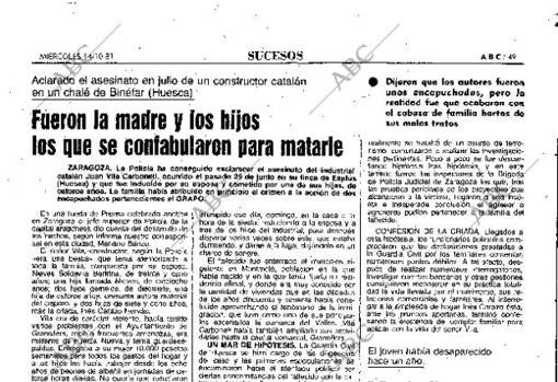 «Ahora que papá está dormido es el momento». Aquellas palabras que Nieves (Neus) Soldevila dirigió a sus hijos eran la señal que estaban esperando. La madre entregó a uno de sus dos hijos varones la pistola que había de acabar con la vida del industrial catalán Juan Vila Carbonell. El chico, de 16 años, cogió el arma y vaciló. Tampoco su gemelo pudo empuñarla para asesinar a su padre. Fue la resuelta Marisol, de 14, quien se decidió a tomar en sus manos el revólver. «Si no os atrevéis vosotros, lo haré yo», les dijo antes de entrar sigilosamente en el dormitorio. Se acercó hasta la cama donde su padre dormía la siesta y le disparó a bocajarro mientras sus hermanos y su madre miraban.