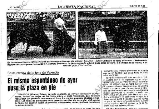 En la fotografía que acompañaba a la nota (la misma que encabeza el artículo), se recogía el momento en que el espontáneo, tras saltar al ruedo por el tendido 10, era detenido por el diestro Pepe Luis Vargas antes de conseguir enfrentarse al toro, un pablorromero, el cuarto de la tarde, que debía lidiar Ruiz Miguel y que fue devuelto a los corrales por cojo.