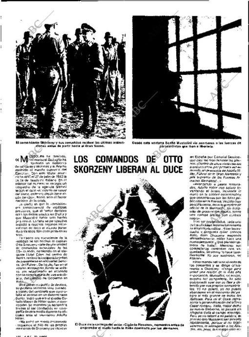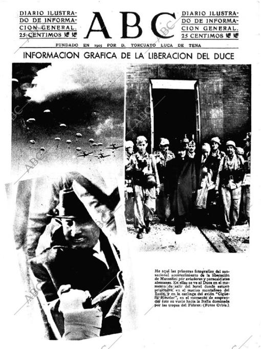 «Con la ayuda de una docena de paracaidistas, armados con fusiles ametralladores, el avión de Skorzeny logró durante una madrugada un aterrizaje perfecto en medio de una espesa niebla y a escasos veinte metros de la escalinata principal del hotel Gran Sasso. Rápidamente - resumió ABC- sus hombres desarmaron a los italianos, que dormían confiados en el cuerpo de guardia. Skorzeny penetró en la habitación donde se hallaba confinado el 'Duce' y, en italiano, le dijo que estaba allí para rescatarle por orden del Führer. Mussolini, entre incrédulo y asombrado, preguntó a su vez: «¿Qué es esto?». Pero ya más calmado, al ver uniformes alemanes a su alrededor, dijo: «Estaba seguro que Hitler no me olvidaría en estas montañas. Vamos». Y poco después Mussolini volaba a bordo de una 'cigüeña' -el pequeño aparato que pilotaba Skorzeny- hacia su reencuentro con Hitler, aunque más tarde, al regresar a Italia, le esperara el trágico fin de todos conocido».