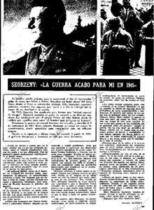 Su nombre estuvo unido a rumores de participaciones en golpes y contragolpes, en operaciones de venta de armas, de rapto de políticos. ¿Qué había de verdad en todo eso?, le preguntó Alférez. Y Skorzeny respondió algo colérico: «La única verdad existente sobre esto es que mi nombre es fuente de ingresos para los periodistas de corte sensacionalista o tendencioso. El noventa por ciento de las cosas que se publican sobre mí son completamente falsas. Mire, amigo, la guerra es algo que para mí acabó en 1945; ahora sólo me ocupo de ella para escribir. Le voy a dar una prueba de las fantasías que se publican sobre mi persona: cuando la guerra 'de los seis días' un periódico de Moscú afirmó que yo había sido el consejero militar de Israel, y ahondando en este mismo absurdo, un diario polaco señaló que yo había suplantado al general Dayan y me hacía pasar por él engañando a todo el mundo».