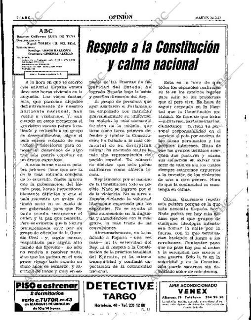 + info«A la hora en que se escribe este editorial España entera lleva seis horas viviendo en la angustia. Los viejos fantasmas, que parecían alejados definitivamente de nuestro horizonte nacional, han vuelto a visitarnos. Y aun cuando en estos momentos el gravísimo suceso aparece localizado y reducido a un grupo de desequilibrados, sigue el país entero colgado de sus radios y televisores para conocer el desenlace de algo que aún podría concluir en un drama espantoso...»