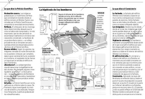+ infoNadie encontraba una explicación convincente a los «fantasmas» del Windsor. La Policía Científica analizó la grabación «fotograma a fotograma» y concluyó que ésta no había sido manipulada y que efectivamente había dos personas dentro del edificio siniestrado, pero los bomberos aseguraron que dichas figuras eran meros reflejos ópticos. En su informe, defendieron que estaban en el edificio de Seguros La Estrella, situado a escasos metros frente a la torre, y que la fachada de vidrio y aluminio de la torre hizo de espejo.