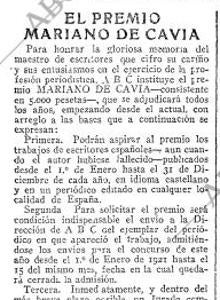 + infoDos días después de la muerte de Mariano de Cavia, que falleció el 14 de julio de 1920, el fundador de ABC y Blanco y Negro, Torcuato Luca de Tena y Álvarez Ossorio, instituyó en su memoria el premio Mariano de Cavia para trabajos firmados que acreditaran de modo sobresaliente las condiciones del buen escritor de periódico. «ABC desea rendir un homenaje al inolvidable maestro, que no fue ni quiso ser más que periodista». Torcuato Luca de Tena