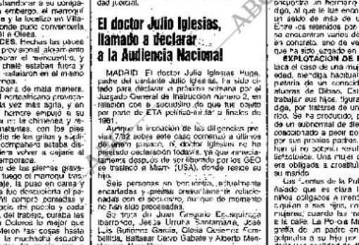 + infoComo suele ocurrir, la pesadilla arrancó cuando cayó el sol. El jueves 31 de octubre, ABC informó del «posible secuestro en Madrid del padre de Julio Iglesias». La familia había corroborado que el ginecólogo se encontraba en paradero desconocido desde hacía 72 horas. La teoría que se barajaba era que había sido capturado en su propio domicilio en plena noche y por personas con las que ya había hablado de forma previa. «Algunas fuentes afirman que fue secuestrado por unos individuos que habían acudido a la casa haciéndose pasar por reporteros de una cadena de televisión extranjera. Habrían salido de la vivienda con el doctor Iglesias con el pretexto de hacerle una entrevista», explicaba este diario.