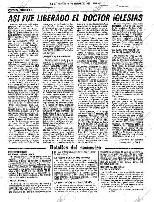 Lo que vino después se sucedió en un suspiro. «La operación duró tan solo unos segundos. El GEO apareció rápidamente en todas las habitaciones de la casa encontrando a sus ocupantes durmiendo», insistía el diario. Los desafortunados eran Luis Guti, su hija Gloria (de 21 años), el novio de esta última (un tal Baltasar Calvo Gavete) y una persona cuya identidad no fue revelada. Los agentes arrestaron sin violencia a todos ellos. Tan solo se resistió uno, que portaba un arma y fue reducido por la fuerza. El oficial al mando se dirigió entonces a la segunda planta y rescató a ‘Papuchi’: «Doctor Iglesias, está usted liberado, enhorabuena». Eran las tres y unos minutos.