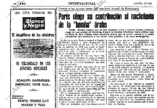 Algo olía raro en la nueva central, aunque nuestros vecinos europeos hicieron oídos sordos. «Los franceses justificaron la venta del reactor y del uranio en que Irak había firmado el acuerdo internacional contra el uso de armas atómicas –no firmado por Israel– y en que la planta fue edificada para tareas de investigación–, desveló este diario. A finales de la década el complejo ya se había levantado y había sido nutrido con trescientos trabajadores y técnicos. La tensión fue en aumento. Hasta tal punto, que el presidente galo, Pierre Mauroy, insistió en «la tensión existente que hay en esta parte del mundo» y calificó la situación de «bastante explosiva» dentro y fuera de Europa.