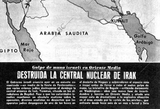 + info«El Gobierno israelí anunció ayer en un escueto comunicado –en medio de la fiesta de Pentecostés– que varios aviones judíos destruyeron el domingo la central atómica de Irak, Tammuz, situada en los alrededores de Bagdad. Pese a que las autoridades israelíes mantienen un absoluto mutismo sobre la operación, diversos analistas no descartan que los aparatos judíos despegaran de una de las bases en el desierto de Neguev y sobrevolaran el espacio sirio e iraquí antes de llevar a cabo el audaz golpe de mano. La iniciativa de Beguin –criticada duramente en Washington– abre una nueva fase de incertidumbre y tensión en Oriente Medio y añade una mayor cota de dramatismo o lo explosiva situación en el área creado por la «crisis de los misiles», que enfrenta desde hace más de un mes a Israel y Siria».