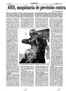 El artículo comenzaba con un repaso de las operaciones del GEO. Una unidad de élite que, en palabras de la periodista, «no había tenido que efectuar un solo disparo» en sus últimas intervenciones gracias a su «rapidez de movimientos».
