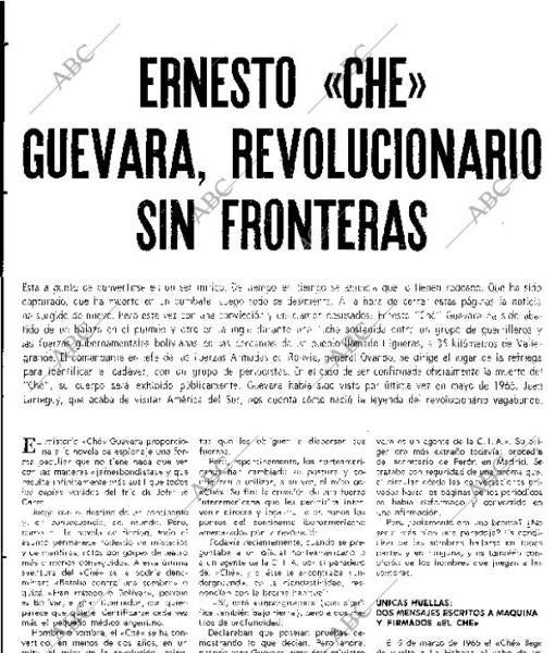 Pero al ‘Che’ también le pasó como al Cid. Hubo un tiempo en que sus enemigos creían verle por doquier; un impasse de meses en el que el mundo se preguntaba dónde diantres andaba, si había muerto o si continuaba con su guerra en las selvas. Fue en esa época –el 10 de octubre– cuando la revista ‘Blanco y Negro’ publicó un reportaje que analizaba su figura bajo el titular ‘Ernesto Che Guevara, revolucionario sin fronteras’. «Está a punto de convertirse en un ser mítico. De tiempo en tiempo se anuncia que lo tienen rodeado. Que ha sido capturado, que ha muerto en un combate. Luego todo se desmiente. A la hora de cerrar estas páginas la noticia ha surgido de nuevo», escribía Jean Larteguy.
