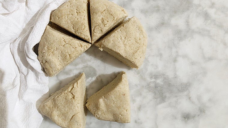 Precalentar el horno a 180 º C. Forrar una bandeja para hornear con papel vegetal. En un bol mediano, combinar la harina de almendra con la de sarraceno, la sal y el polvo de hornear. Remover hasta que se combinen. Añadir a continuación el yogur griego y el vinagre de manzana y seguir mezclando con una cuchara. Cuando tome consistencia, amasar ligeramente con la mano para acabar de integrar los ingredientes y obtener una textura que no sea pegajosa demasiado pegajosa. Formar un círculo sin estirar y cortar en 6 porciones iguales con la ayuda de un cuchillo.