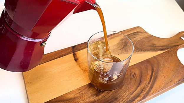En otro vaso ponemos unos hielos y los 100 gramos de café.