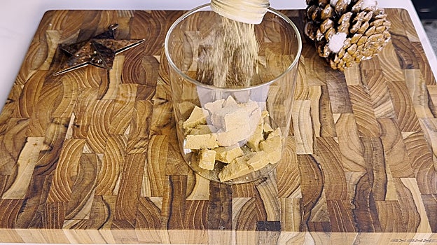 Comenzamos añadiendo al vaso de la trituradora el turrón blando (procura elegir aquel que aporte un 70% de contenido de almendras como mínimo), una cucharada de canela, media cucharada de jengibre en polvo y la leche caliente