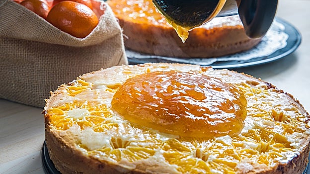 Sacamos el bizcocho del horno y dejamos reposar unos 15 minutos Mientras, en un cazo templamos la mermelada (no debe hervir, sólo soltarse un poco). Desmoldamos el bizcocho y le damos la vuelta, de modo que las naranjas o mandarinas queden arriba. Con la ayuda de una espátula extendemos la mermelada por encima de las naranjas o mandarinas. Dejamos enfriar y servimos. Recuerda que puede conservarse en nevera (tapado, para que no se seque) durante 3-4 días.