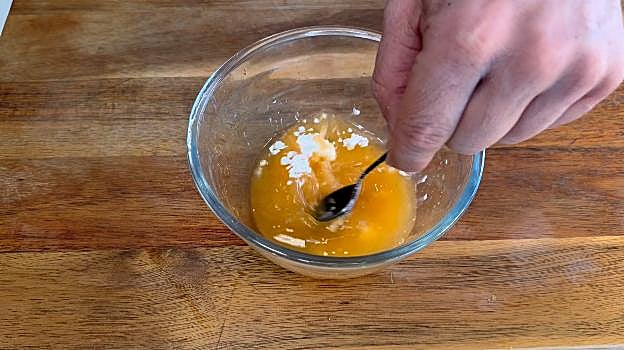 Añadimos una cucharadita de maicena, jengibre en polvo, mezclamos bien y pasamos a un cazo. Cocinamos ligeramente hasta que empiece a espesar y añadimos una cucharadita de miel.
