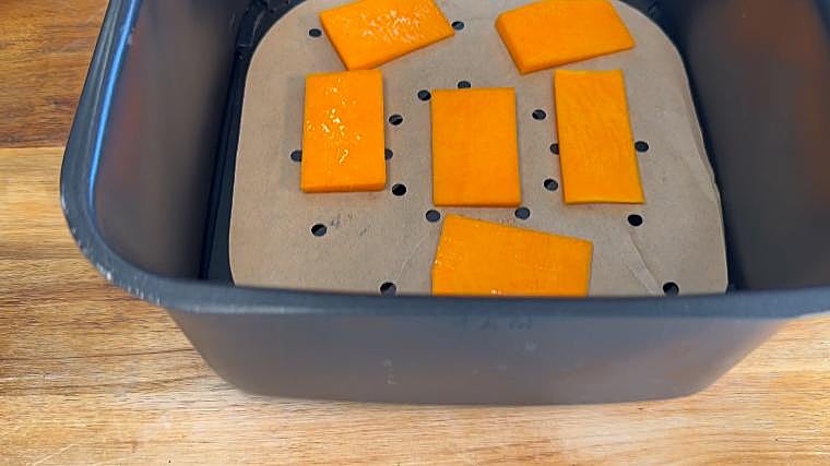 Lo primero que haremos será cortar la calabaza en este tamaño. Impregnamos con aceite de oliva y cocinamos en airfryer.
