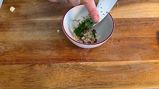 Picamos almendras, hacemos lo mismo con un diente de ajo, un poco de perejil y ponemos sal y un poco de aceite de oliva. Mezclamos bien y lo repartimos sobre nuestra calabaza y queso curado y terminamos poniendo la salsa encima. ¡Y listo!