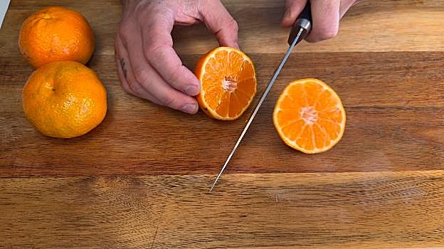 Mientras vamos a cortar unas mandarinas y sacamos el zumo.