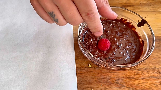 Mojamos las frambuesas y las cubrimos bien con el chocolate. Las ponemos en papel de horno.