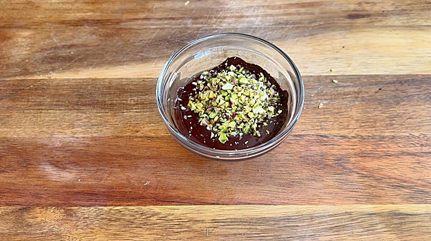 Añadimos los pistachos troceados y aceite de coco y mezclamos bien.