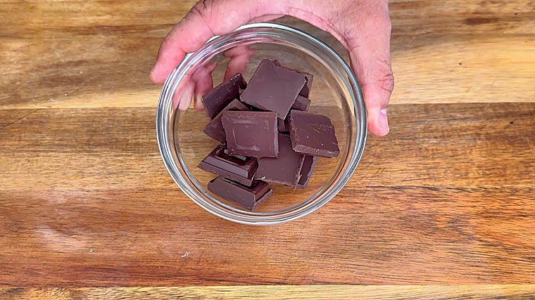 Troceamos el chocolate puro y lo fundimos 30 segundos en el microondas.