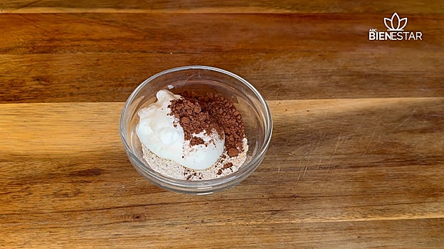 En otro bol preparamos la crema: ponemos los copos de avena triturados, el cacao y el yogur. Removemos bien hasta que quede una crema suave y homogénea.