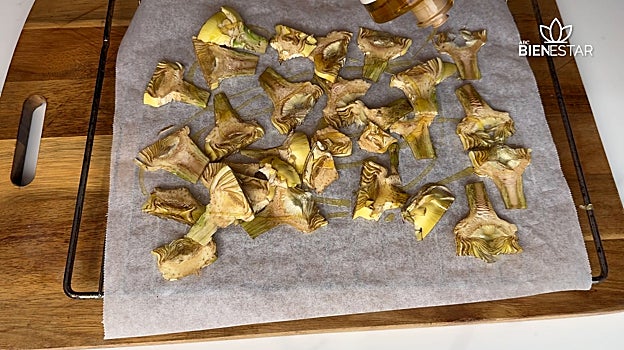 Cortamos en láminas finas y las esparcimos sobre papel de horno. Impregnamos bien con aceite de oliva, ponemos un poco de sal y pintamos y horneamos bien durante unos 20 minutos a 200ºC.