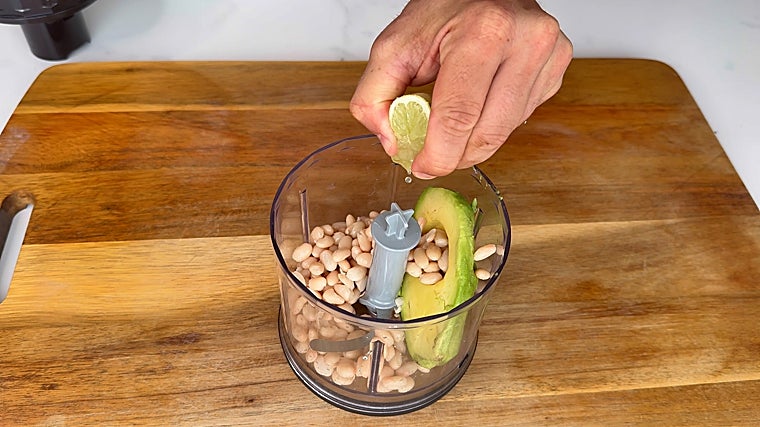 En una trituradora ponemos medio aguacate, las alubias ya cocidas y el chorro de medio limón.