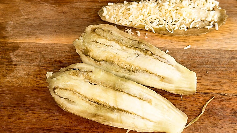 Comenzaremos haciendo agujeros con el tenedor en las berenjenas. Añadimos un poco de aceite de oliva virgen extra y se hornean primero las berenjenas durante 40 o 50 minutos a 200º. Dejamos que atempere ligeramente, quitamos la piel, cortamos por la mitad, abrimos y añadimos nuestro queso preferido. Reserva.