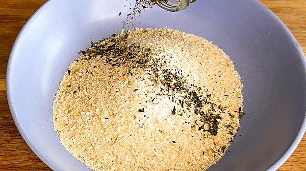 Para el rebozado mezclamos los copos de yuca con sal, pimienta y orégano, aunque puedes poner tus especias preferidas. Mezclamos bien. Reservamos. En un bol ponemos un huevo batido e impregnamos cada berenjena.