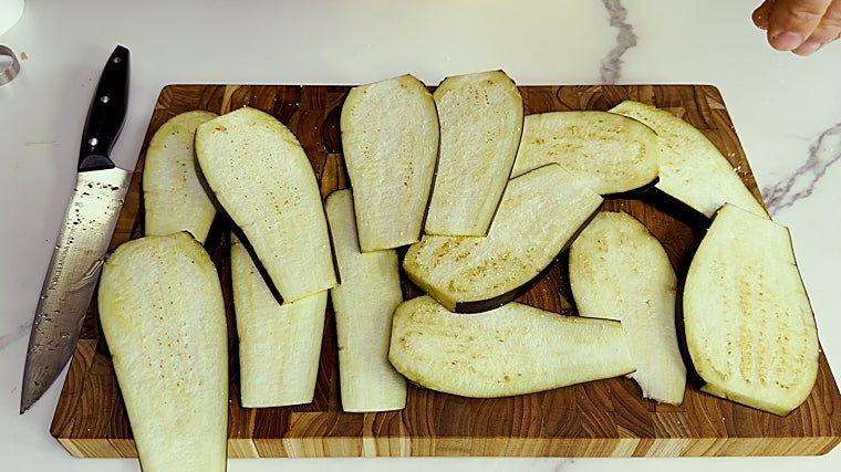 Comenzaremos preparando las berenjenas. Las cortaremos en finas láminas, añadimos sal para quitar el amargor y metemos en el horno hasta que estén en su punto, es decir, unos 20 minutos a 200ºC sin aire.