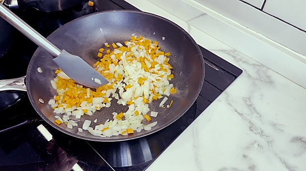 Para la boloñesa, picamos una cebolla, una zanahoria y cocinamos un poco con aceite de oliva. Cocinamos la carne, sal, pimienta y orégano.