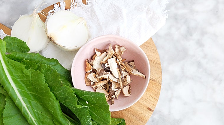 Opcional: si nos gusta un sabor a setas más intenso podemos utilizar una pequeña cantidad de setas deshidratadas como boletus o shitakes que hidratamos al comienzo de la receta con agua caliente. En el último momento, escurrimos el agua y salteamos con un chorrito de aceite de oliva. Decoramos el plato con estas setas que nos aportarán un extra de sabor y textura.