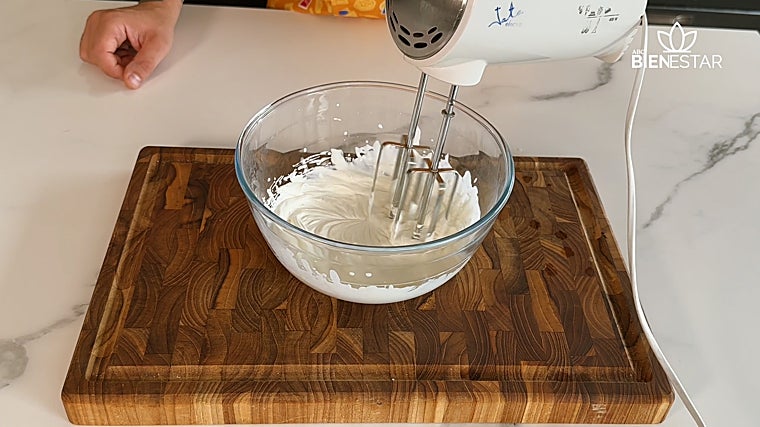 Empezamos con la nata bien fría en un bol y la batimos con una barilla para que no salpique, ya que con una eléctrica al principio puede salpicar. Ahora tenemos nata semimontada y con las barillas eléctricas montamos hasta que quede completamente pegado al bol, como en el vídeo.