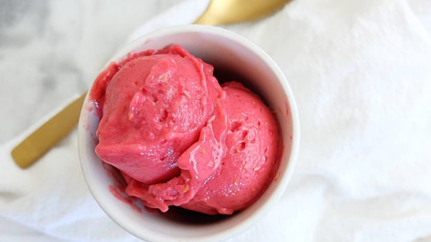 Podemos servirlo directamente o, si queremos una textura aún más firme, trasladarlo a un molde rectangular e introducirlo en el congelador durante un par de horas, moviéndolo de vez en cuando para evitar la formación de cristales. Podemos servir con hojas de menta, pistachos picados o frambuesas (tanto frescas como congeladas).