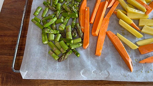 Los colocamos junto al boniato y la patata y lo metemos en el horno hasta que se doren las verduras.