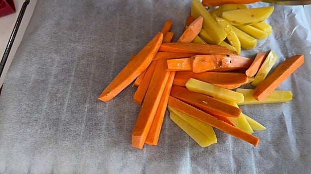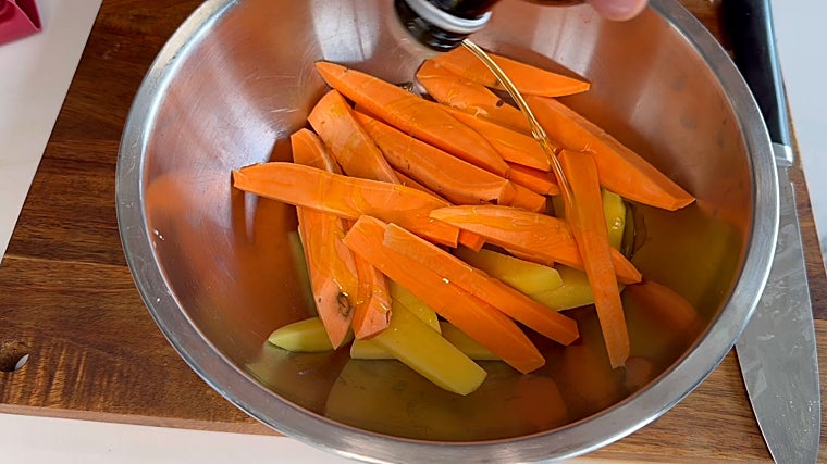 Cogemos un boniato y lo vamos a cortar en bastones del tamaño de una típica patata frita. Hacemos lo mismo con una patata. Lo pasamos a un bol añadimos aceite de oliva.