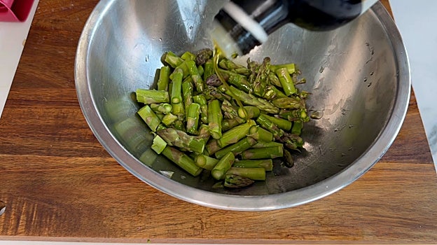 Cogemos un par de espárragos y los cortamos en trocos pequeños. Los ponemos en un bol y añadimos también aceite de oliva virgen extra.