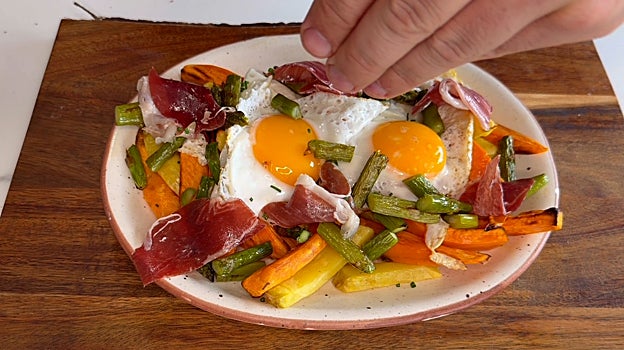 La receta de huevos rotos con boniatos y espárragos que propone el Chef Bosquet para una cena rápida y nutritiva